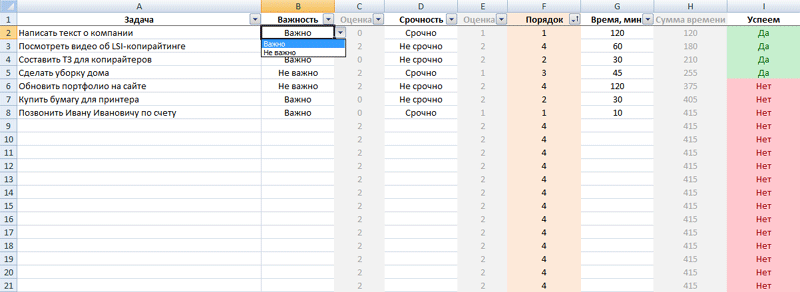 По умолчанию шаблон определяет, какие задачи, в первую очередь из списка важных и срочных, можно успеть выполнить за 6 часов. Остальные помечает как невыполнимые. При необходимости алгоритм можно изменить путем редактирования формул в Excel.