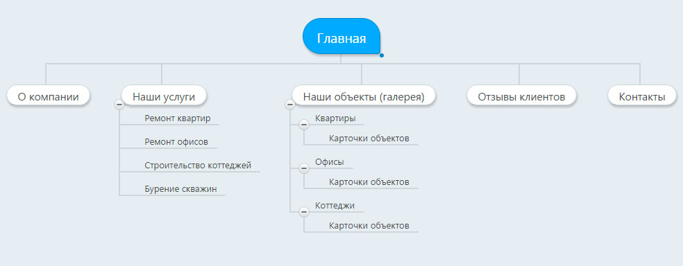 В данном примере показана простейшая структура сайта для строительной компании, оказывающей услуги по ремонту квартир, офисов, строительству коттеджей и бурению скважин. Каждая услуга имеет отдельную страницу. При необходимости в раздел с описанием услуг можно добавить новые страницы. Примеры работ выделены в отдельный раздел, сделанный в виде галереи. При необходимости в галерею можно добавить новые проекты компании.