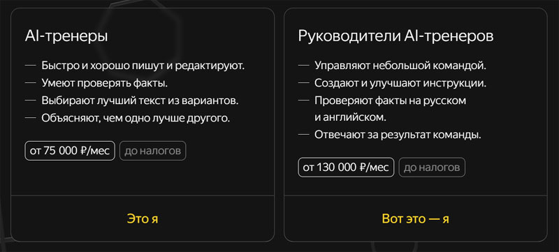 В данный момент Яндекс активно ведет набор специалистов на должность AI тренера. По информации на сайте компании, такие сотрудники могут получать от 75 тыс. рублей в месяц. Руководители тренеров, которые управляют небольшими командами, могут зарабатывать от 130 тыс. руб. в месяц.